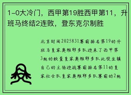 1-0大冷门,西甲第19胜西甲第11,升班马终结2连败,登东克尔制胜